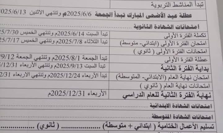 على ان ينتهي العام الدراسي في 31/12/ 2025م