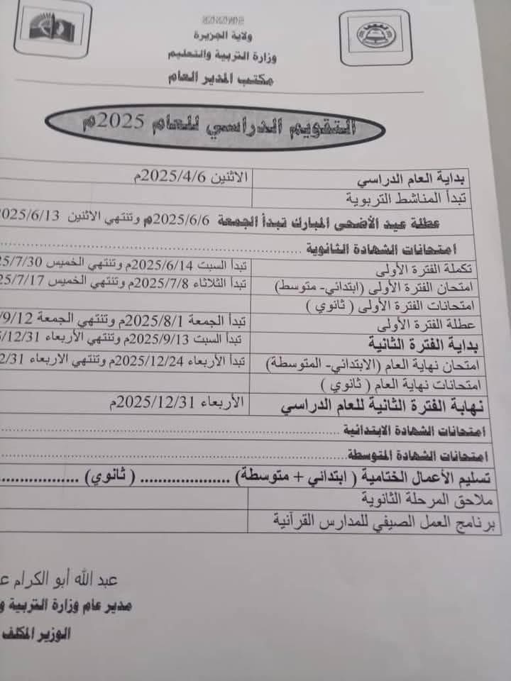 أعلن عبد الله أبو الكرام مدير عام وزارة التربية والتعليم ولاية الجزيرة عن التقويم الدراسي للعام 2025 م وذلك عقب إستئناف الدراسة بعد توقف دام لأكثر من عام بولاية الجزيرة