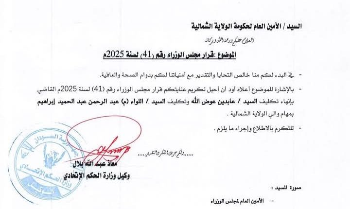 إعفاء والي الشمالية وتعين عبدالرحمن عبدالمجيد خلفاً له أخبار الولايات بواسطة منصة السودان في أبريل 21, 2025 1٬610 0 نص قرار الإعفاء متابعة ـ منصة السودان ـ المزيد من المشاركات انعقاد امتحانات الشهادة الإبتدائية في الخرطوم فبراير 4, 2026 القائد العام يصدر قرارات شُجاعة فبراير 3, 2026 أصدر وكيل الحكم الاتحادي معز عبدالله بلال قرار بإقالة والي الولاية الشمالية عابدين عوض الله وتعيين عبد الرحمن عبد الحميد ابراهيم خلفا له، وذلك وفق قرار مجلس الوزراء السوداني رقم 41 لسنة 2025م اضغط هنا للانضمام الى مجموعاتنا في واتساب إعفاءالشماليةوالي
