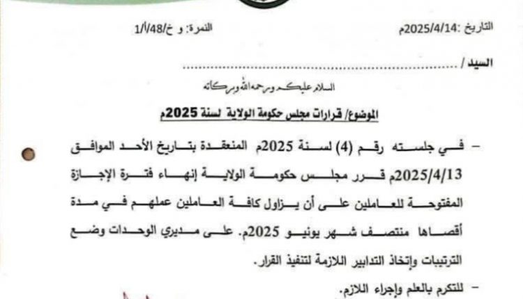 اصدر الأمين العام لحكومة ولاية الخرطوم الهادي عبد السيد إبراهيم تعميما لقرار حكومة ولاية الخرطوم والذى قضى بإنهاء فترة الإجازة المفتوحة للعاملين على أن يزاول كافة العاملين عملهم في مدة أقصاها منتصف شهر يونيو ٢٠٢٥م وعلى مديري الوحدات وضع الترتيبات واتخاذ التدابير اللازمة لتنفيذ القرار.