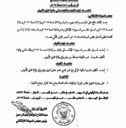 تحصلت منصة السودان الاخبارية على صورة من نص قرار مجلس السيادة الانتقالي القاضي بانهاء تكليف والي النيل الابيض عمر الخليفة وتكليف اللواء معاش قمر الدين محمد فضل المولى بتسيير مهام الولاية