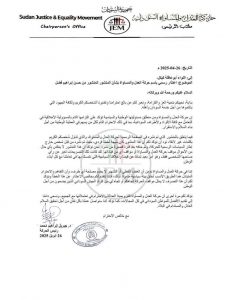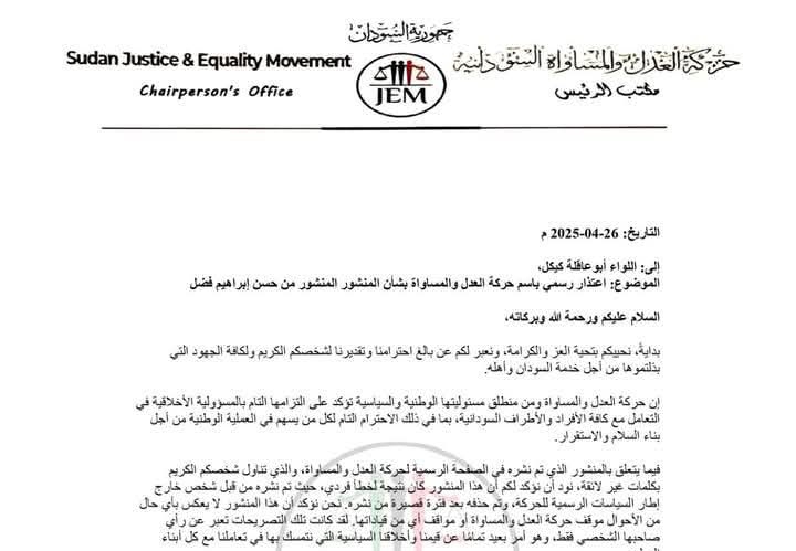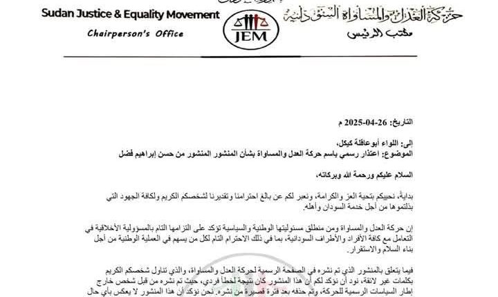 اعتذر رئيس حركة العدل والمساواة السودانية وزير المالية جبريل ابراهيم عبر خطاب رسمي لقائد قوات درع السودان اللواء أبوعاقلة كيكل، وذلك على خلفية مقال نشرته الحركة في صفحتها على الفيس بوك اثار جدلا واسعا ، وتشهد العلاقة بين جبريل وكيكل توتر شديد في اعقاب انتقاد الاخير لوزارة المالية لعدم اهتمامها بمشروع الجزيرة وتوقيف الدعم عنه بحسب زعم اللواء ابوعاقلة كيكل