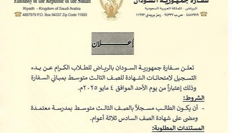 أعلنت سفارة جمهورية السودان بالرياض للطلاب الكرام عن بدء التسجيل لامتحانات الشهادة للصف الثالث متوسطة وذلك بمباني السفارة إعتباراً من يوم الأحد الموافق 4 مايو 2025