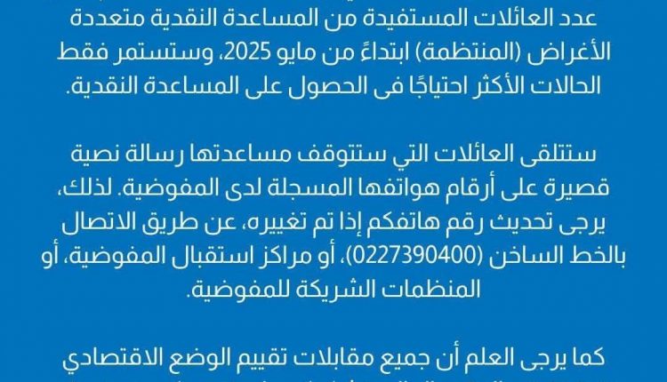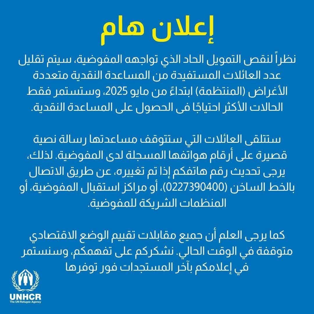 وقف المساعدات النقدية التي تقدم للعلائلات اللاجئة في مصر،وذلك بسبب نقص التمويل، الذي وصفته المفوضية بـ الحاد،وكشفت المفوضية عن تقليل عدد العائلات المستفيدة من المساعدة النقدية متعددة الأغراض المنتظمة ابتداءً من مايو 2025، وستستمر فقط الحالات الأكثر احتياجًا فى الحصول على المساعدة النقدية.