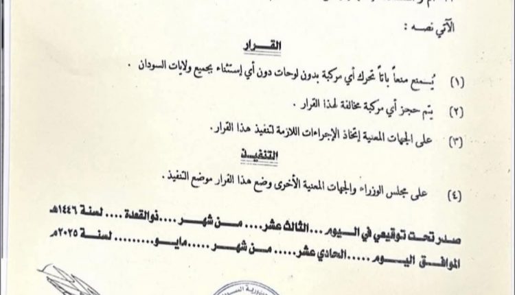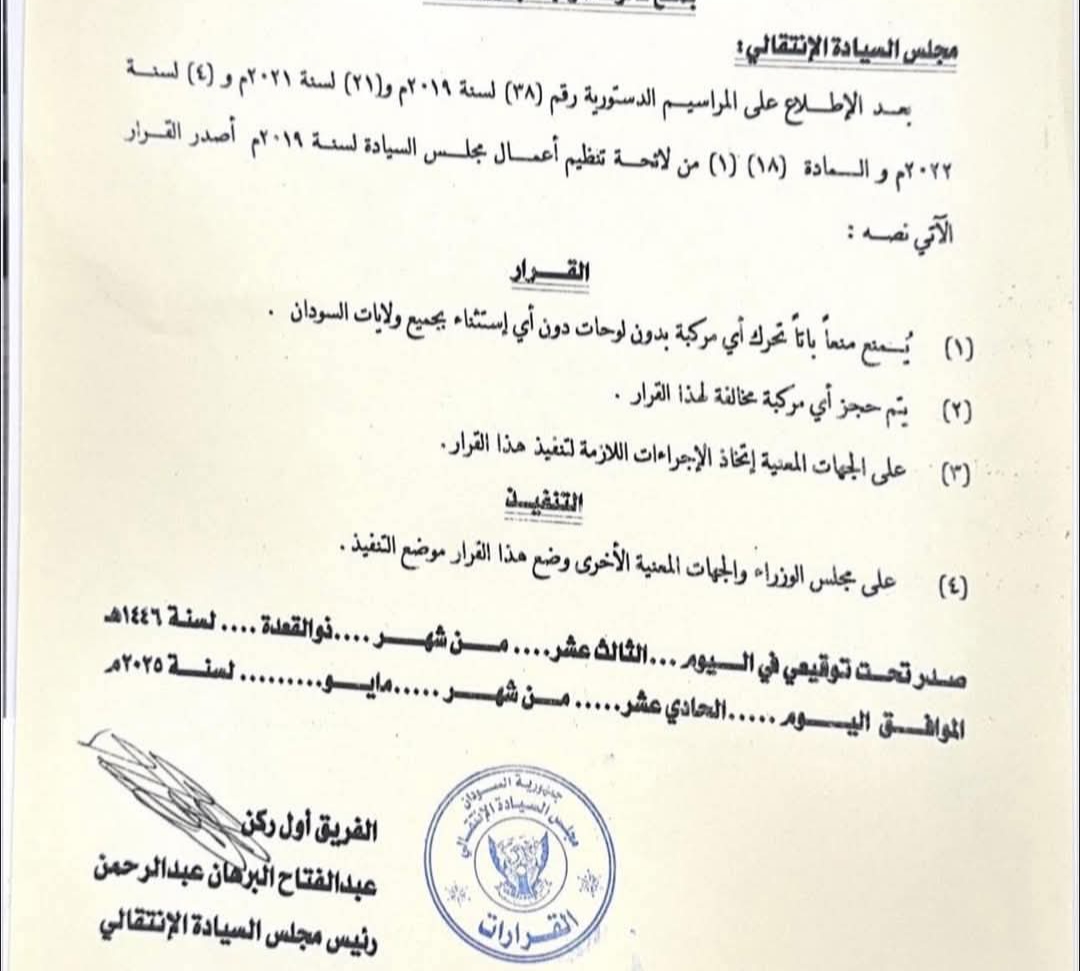 أصدر رئيس مجلس السيادة الانتقالي الفريق أول ركن عبدالفتاح البرهان، قرار بمنع حركة السيارات بدون لوحات في كل ولايات السودان ، ووجه القرار مجلس الوزراء والجهات المعنية تنفيذه فوراً