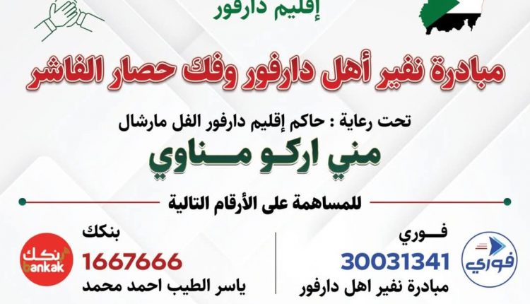 تنطق اليوم الخميس بدار رابطة ابناء دارفور بولاية البحر الأحمر فعاليات مبادرة نفير اهل دارفور وفك وانهاء الحصار على مدينة الفاشر برعاية كريمة من حاكم اقليم دارفور مني اركو مناوي تحت شعار: ايدينا للبلد