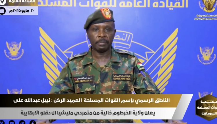 وفي هذا السياق نعلن اليوم اكتمال تطهير كامل ولاية الخرطوم من أي وجود لعناصر مليشيا آل دقلو الإرهابية وتطهير عاصمتنا الوطنية من دنس المتمردين وأعوانهم مؤكدين أن (ولاية الخرطوم خالية تماماً من المتمردين).