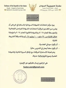 ترتيبات مكثفة تقوم بها السفارة السودانية في الرياض وذلك في اطار الاستعدادات لانعقاد امتحانات الشهادة السودانية المؤجلة من العام 2024 والمنعقدة في 29 يونيو 2025، واعلنت السفارة فتح باب التقديم لاستيعاب مراقبين ومراقبات للمشاركة في أعمال المراقبة للمراحل الابتدائيه والمتوسطة ، للعام 2025.