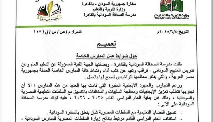 أصدرت مدرسة الصداقة السودانية بالقاهرة التابعة لـ”سفارة السودان بالقاهرة، بيانًا بشأن ضوابط عمل المدارس السودانية الخاصة في مصر للعام الدراسي الجديد 2025- 2026م.