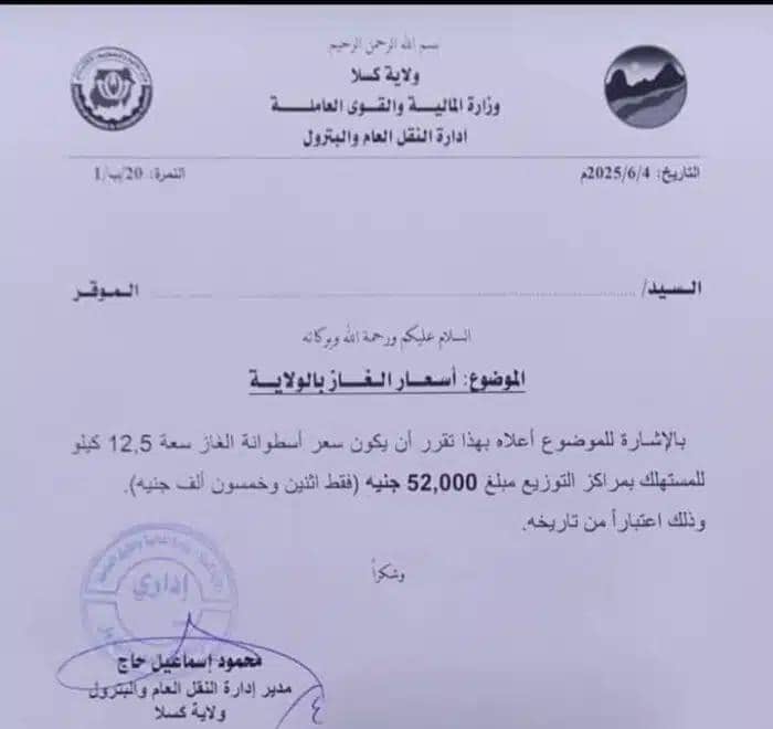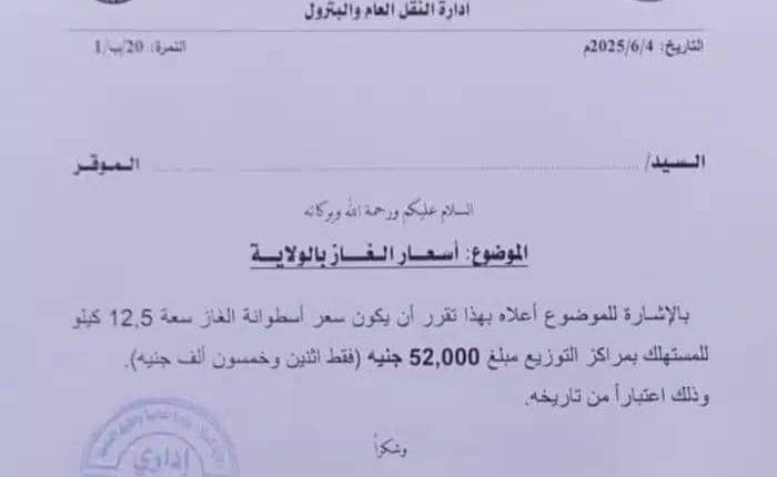 بصورة مفاجئة، أعلنت إدارة النقل والبترول بولاية كسلا عن تسعيرة جديدة لـ غاز الطهي، في خطوة قالت إنها تهدف إلى تنظيم سوق توزيع الغاز وضبط الأسعار بما يتناسب مع التكاليف التشغيلية وواقع السوق المحلي، حيث بلغ سعر الأسطوانة الواحدة من المستودع 52,000 جنيه