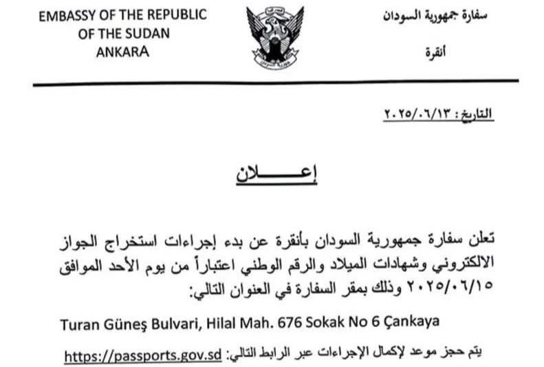 أعلنت سفارة جمهورية السودان في دولة تركيا اليوم الجمعة 13 يونيو 2025م، عن بدء إجراءات استخراج الجواز الإلكتروني وشهادات الميلاد والرقم الوطني وذلك اعتبارا من يوم الاحد الموافق 15 يونيو، بمقر السفارة في مدينة أنقرة ، وكشفت السفارة عن رابط للتقديم وتكملة الاجراءات ، كما اصدرت تنويه قالت فيه ادخال بيانات الشخص المعني بالاجراء فقط مع التقيد بالضوابط الموضحة في صفحة تأكيد الحجز