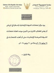 اصدرت سفارة جمهورية السودان بالمملكة العربية السعودية الرياض، اعلان للطلاب بتاجيل امتحانات الشهادة للمرحلة الابتدائية الى يوم 19 يوليو بدلا عن 21 يونيو، بحسب منشور على صفحة السفارة بالفيس بوك.
