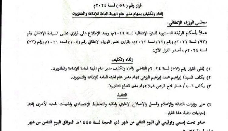 ولم تمض سوى ساعات حتى أصدر الوزير قرارا آخر بإعادة تكليف إبراهيم محمد إبراهيم البزعي بمهام مدير عام الهيئة العامة للإذاعة والتلفزيون، وتكليف عمار فتح الرحمن شيلا بمهام مدير قطاع التلفزيون.