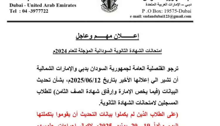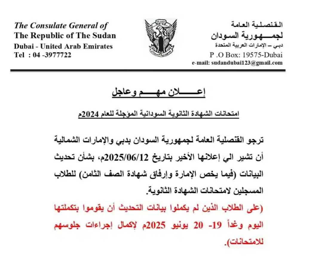 تولي قنصلية جمهورية السودان بدبي و الإمارات الشمالية قضية جلوس ، طلاب الشهادة السودانية الممتحنين بدولة الامارات باهتمام كبير وطالبت القنصلية في منشور اليوم الخميس بضرورة تحديث البيانات .