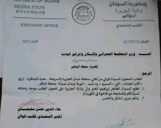وجه والي الجزيرة الطاهر الخير وزير التخطيط العمراني ببدء صيانة محطة كهرباء الباقير التي تمد، المسيد، السريحة، البشارقة، كاب الجداد، ألتي، السريحة، أزرق، فورا ، وذلك بالتنسيق مع ادارة الكهرباء