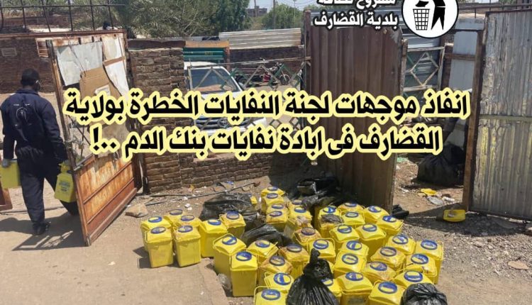 تم اليوم ابادة كل تكدسات نفايات بنك الدم المركزى بولاية القضارف والتى تشتمل على حاويات اكياس الدم الفاسد والنفايات الطبية ذات الصلة ببنك الدم لحوالى 270 حاوية بإجمالي 3 طن من النفايات الطبية باشراف لصيق من الدكتور أحمد الامين آدم ، مدير عام وزارة الصحة والتنمية الإجتماعية الوزير المكلف ، بحضور د. مصعب برير حاج أحمد مدير نظافة بلدية القضارف عضو اللجنة.
