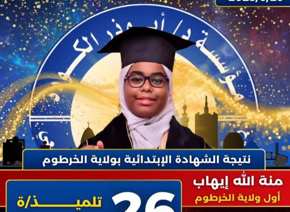 الطالبة منة الله إيهاب تحرز المرتبة الأولى في إمتحانات الشهادة المتوسطة بالخرطوم