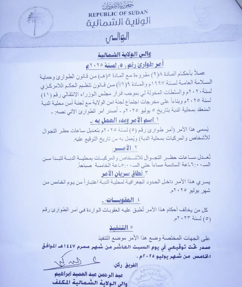 أصدر والي الولاية الشمالية، الفريق ركن عبد الرحمن عبد الحميد، أمر طوارئ رقم (5) للعام. للعام 2025، متضمنًا تعديل ساعات حظر التجوال للأشخاص والمركبات بمحلية الدبة.