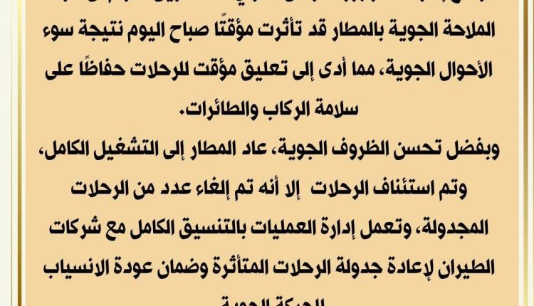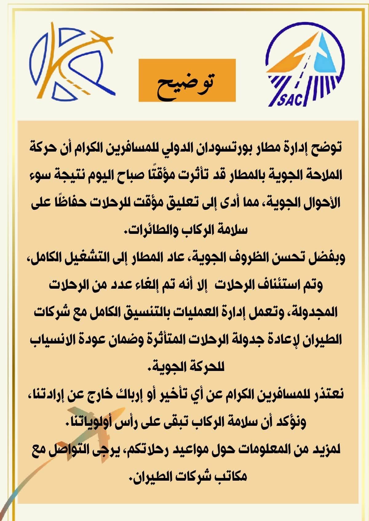 توضح إدارة مطار بورتسودان الدولي للمسافرين الكرام أن حركة الملاحة الجوية بالمطار قد تأثرت مؤقتًا صباح اليوم نتيجة سوء الأحوال الجوية، مما أدى إلى تعليق مؤقت للرحلات حفاظًا على سلامة الركاب والطائرات.