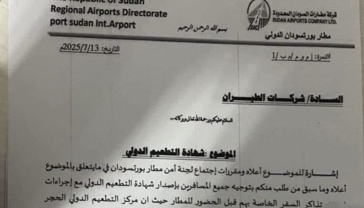 وقال في تعميم إنه إشارة للموضوع أعلاه ومقررات إجتماع لجنة أمن مطار بورتسودان في ما يتعلق بالموضوع أعلاه وما سبق من طلب منكم بتوجيه جميع المسافرين بإصدار شهادة التطعيم الدولي مع إجراءات تذاكر السفر الخاصة بهم قبل الحضور للمطار.