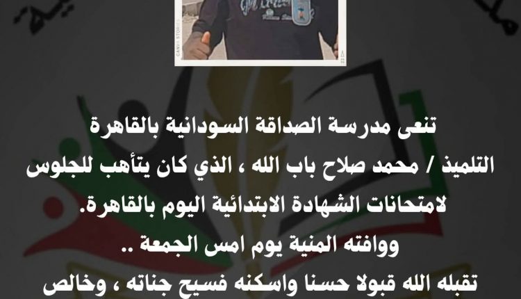 تنعى مدرسة الصداقة السودانية بالقاهرة التلميذ / محمد صلاح باب الله ، الذي كان يتأهب للجلوس لامتحانات الشهادة الابتدائية اليوم بالقاهرة، ووافته المنية يوم امس الجمعة.