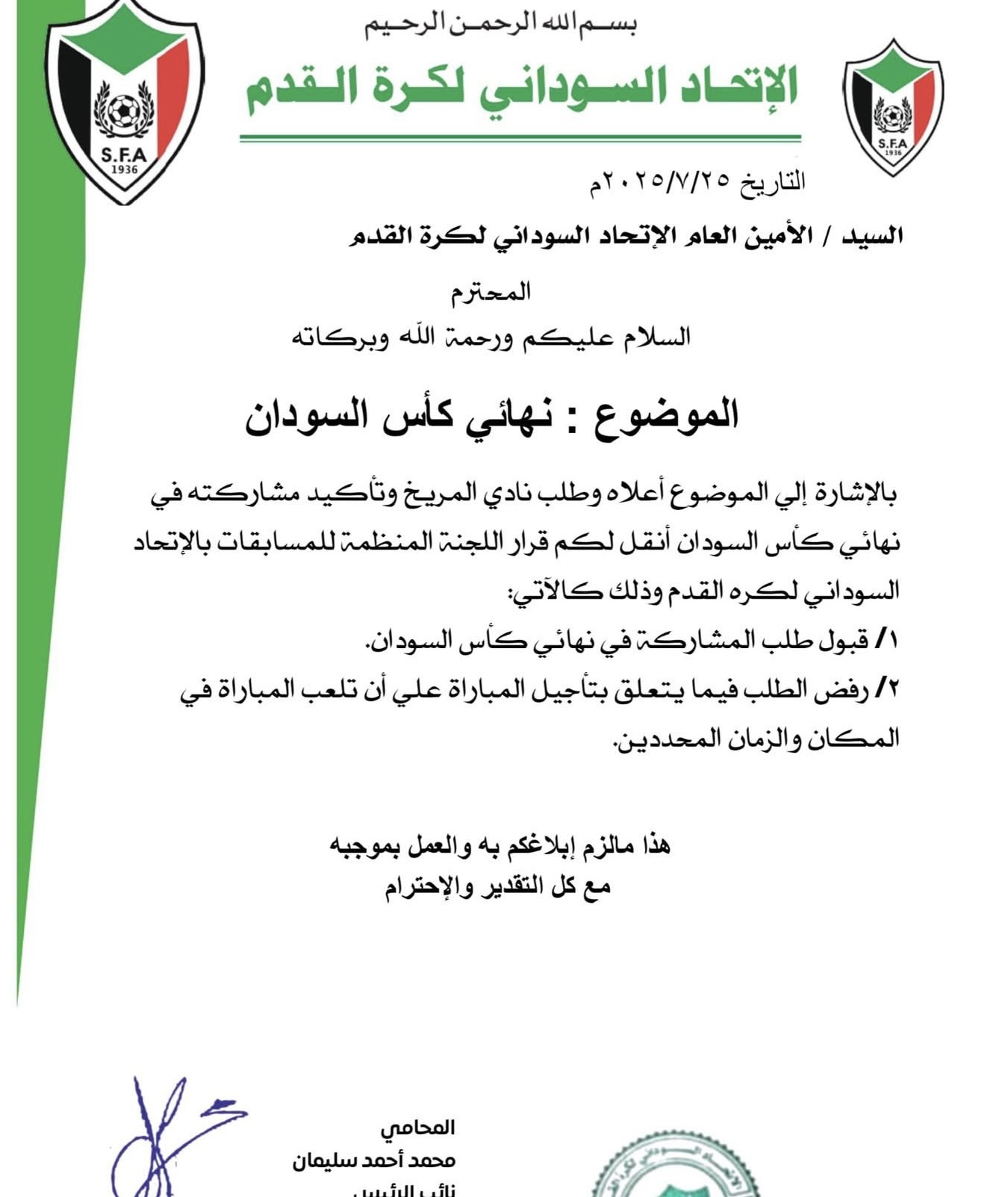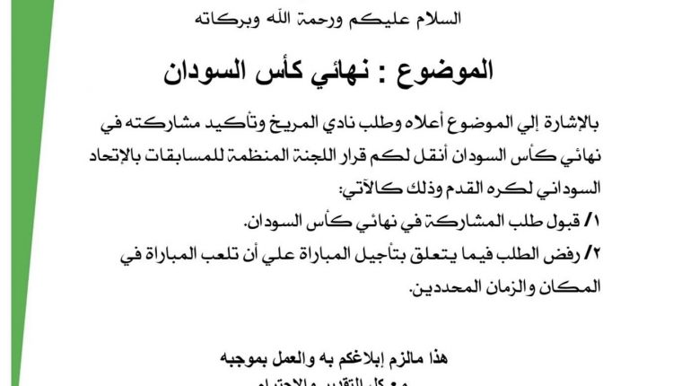 وخاطب الامين العام للاتحاد رسميا ادارة المريخ وابلغها بقرار الرفض واتمسك بقيام المباراة في المكان والزمان المحددين