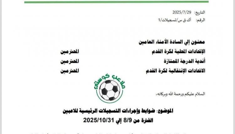 اتحاد كرة القدم يحدد فترة التعاقدات الرئيسية في السودان رياضة بواسطة منصة السودان في يوليو 30, 2025 26 0 Oplus_0 متابعة – منصة السودان – المزيد من المشاركات وزير يتخذ أهم قرار بشأن الشباب في الخرطوم مارس 1, 2026 الهلال يخسر بثلاثية في الدوري الرواندي فبراير 28, 2026 أعلن الإتحاد السوداني لكرة القدم، عن تحديد فترة التعاقدات الرئيسية عبر خطاب رسمي، جاء فيه أن عمليات الإحلال والإبدال، ستبدأ فعاليتها إعتباراً من التاسع بالشهر المقبل، وتستمر حتى الحادي والثلاثون من أكتوبر. اضغط هنا للانضمام الى مجموعاتنا في واتساب اتحادالسودانيالقدمكرة