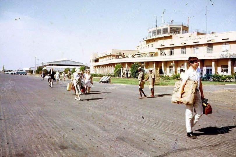 صورة أرشيفية ترصد جمال مطار الخرطوم الدولي في عام 1965، حيث يظهر المطار في تلك الفترة مبنى صغيرًا أنيقًا يمتزج بين التصميم المعماري الحديث واللمسات المحلية، وتظهر الصورة أيضًا أبراج المراقبة والطائرات المتوقفة على المدرجات، مما يعكس حجم الحركة الجوية في ذلك الوقت.