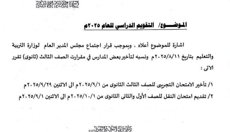 - 1/ تأخير الامتحان التجريبي للصف الثالث الثانوي من يوم ٢٠٢٥/٩/١ إلى يوم الاثنين ٢٠٢٥/٩/٢٩