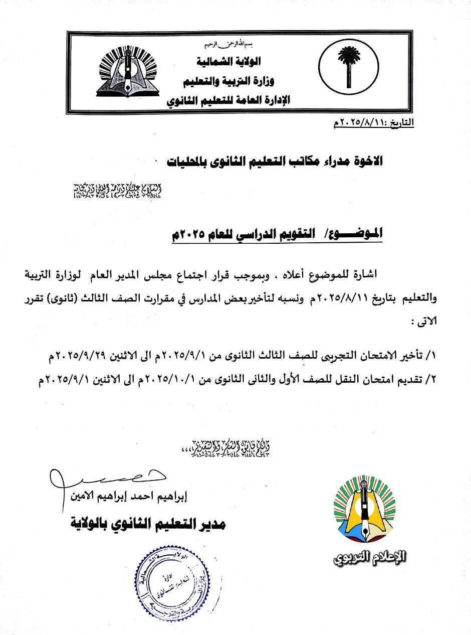 قرر مجلس المدير العام لوزارة التربية والتعليم بالولاية الشمالية ونسبة لتأخير بعض المدارس في مقررات الصف الثالث ثانوي تقرر الآتي