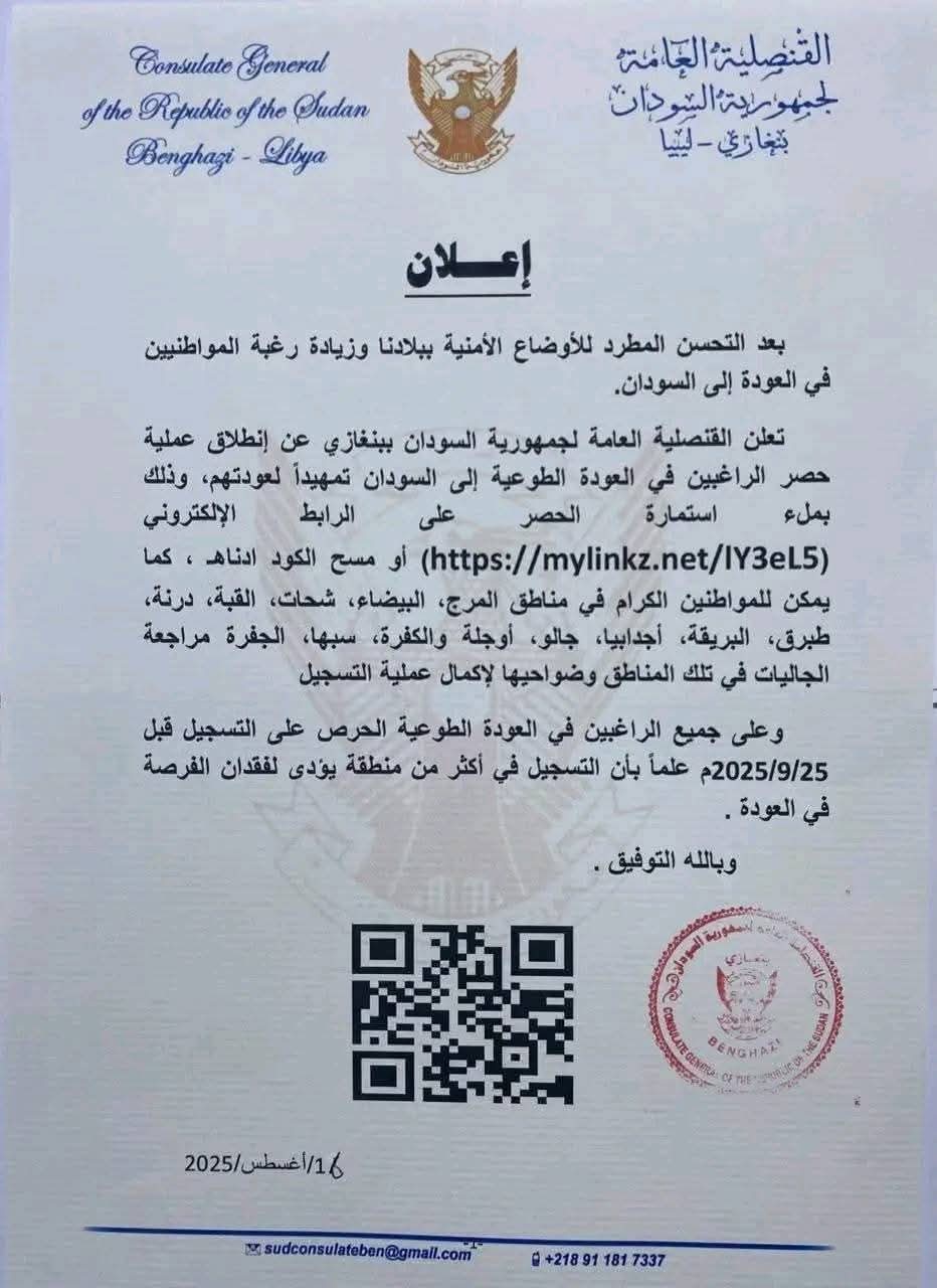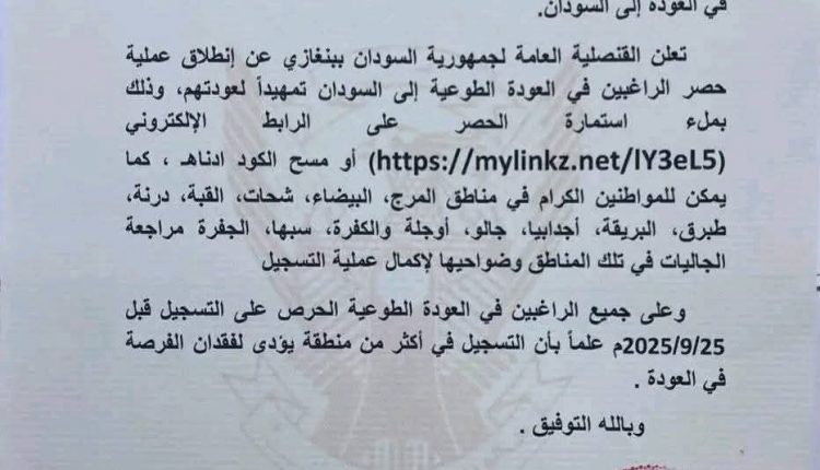 قنصلية السودان في بنغازي تبدأ التسجيل للعودة الطوعية تقارير بواسطة منصة السودان في أغسطس 16, 2025 637 0 متابعة – منصة السودان – المزيد من المشاركات رسالة مؤثرة من البرهان للنازحين فبراير 3, 2026 البرهان: قواتنا ستصل دارفور ونبارك لأهل كادقلي فبراير 3, 2026 اعلنت القنصلية السودانية في بنغازي عن بدء تسجيل الراغبين في العودة الطوعية إلى السودان، وذلك عبر الرابط الإلكتروني المخصص أو عبر مراجعة الجاليات في مناطق “المرج، البيضاء، شحات، القبة، درنة، طبرق، البريقة، إجدابيا، الواحات، الكفرة، سبها، الجفرة”. اضغط هنا للانضمام الى مجموعاتنا في واتساب السودانيين في ليبياالعودة إلى السودانالقنصلية السودانية ببنغازيبنغازي الليبية