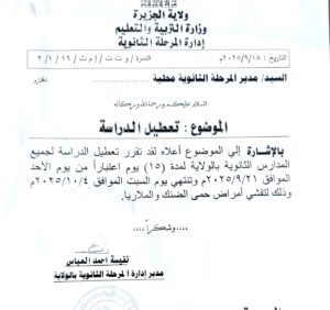 أعلنت مدير المرحلة الثانوية بولاية الجزيرة الاستاذه نفسيه احمد العباس عن تعطيل الدراسه بجميع المدارس الثانوية لمدة خمسة عشر يوما اعتباراً من يوم الأحد 2025/9/21 وتنتهي يوم السبت 2025/10/4 بسبب تفشي حمى الضنك والملاريا .