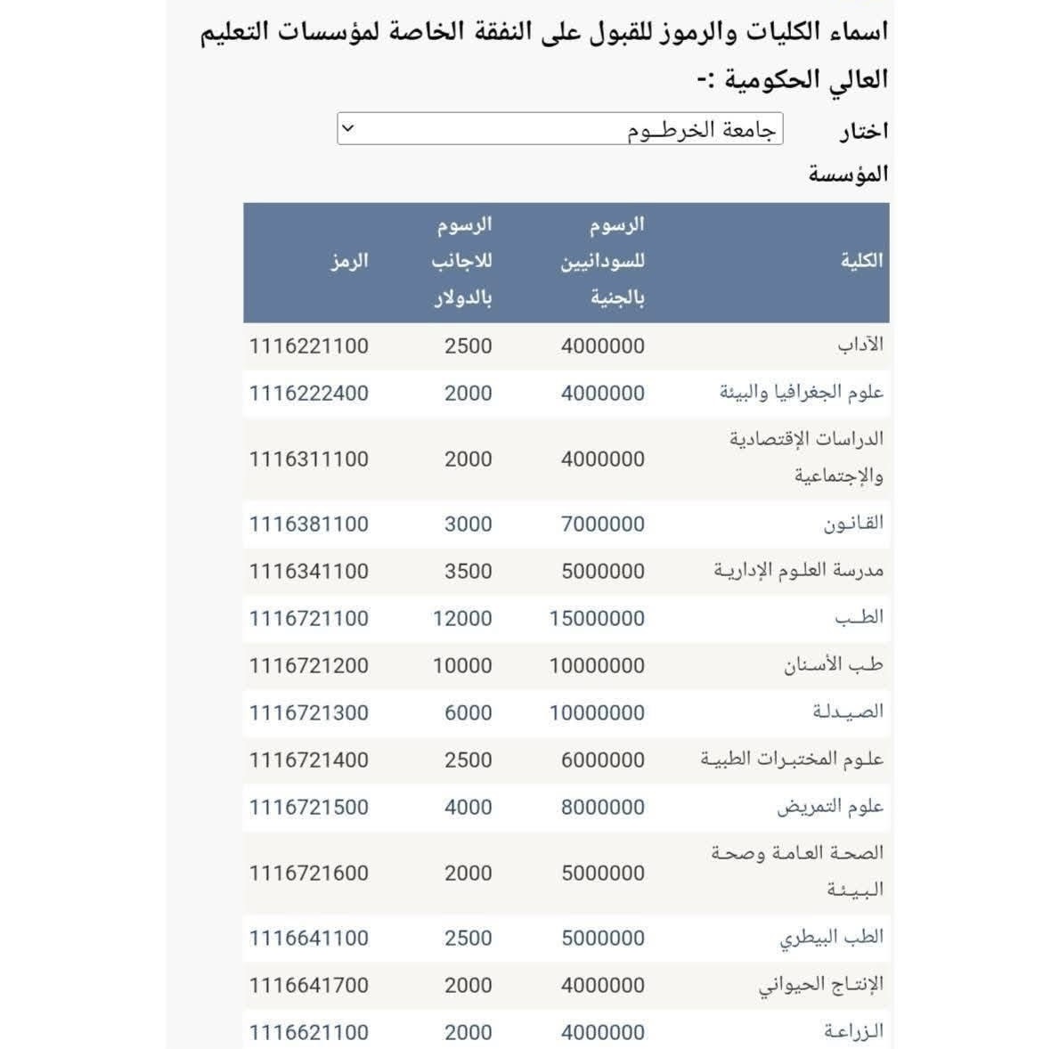 تعلن الإدارة العامة للقبول وتقويم وتوثيق الشهادات أنه استجابة لمناشدات السادة اولياء الامور فقد قررت جامعة الخرطوم إجراء تخفيض على الرسوم الدراسية المقررة لكافة برامج القبول على النفقة الخاصة