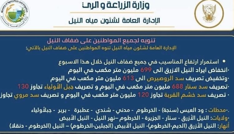 • إنخفاض إيراد النيل الأزرق إلى 699 مليون متر مكعب في اليوم، وتخفيض تصريف سد الروصيرص إلى 613