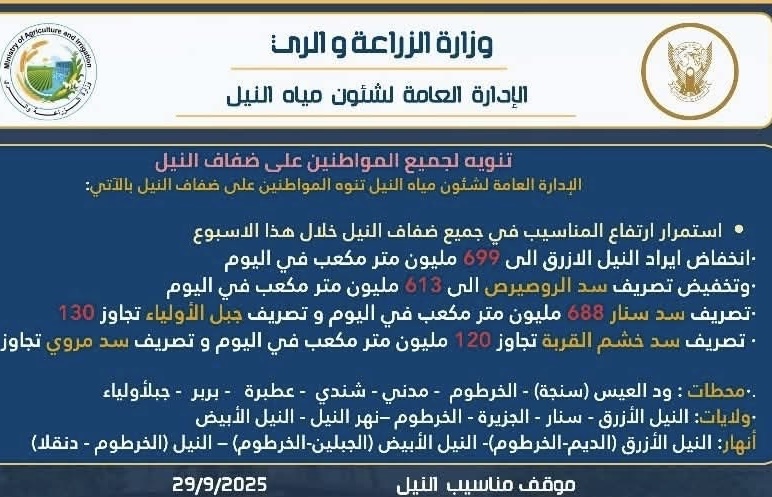 تحذير من وزارة الري والموارد المائية لجميع المواطنين على ضفاف النيل