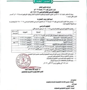وأوضح جدول التقويم المدرسي أن بداية المرحلتين الابتدائية والمتوسطة يوم الأحد 14 سبتمبر الماضي، فيما تنتهي الدراسة يوم الثلاثاء 27 يناير 2026.