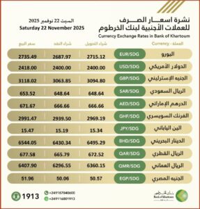 جدول يوضح أسعار العملات ببنك الخرطوم اليوم.