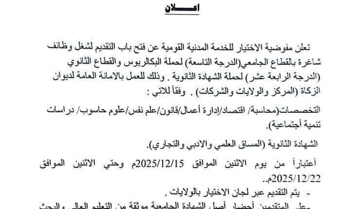 وذلك للعمل بالأمانة العامة لديوان الزكاة (المركز والولايات والشركات) وفقاً للاتي: