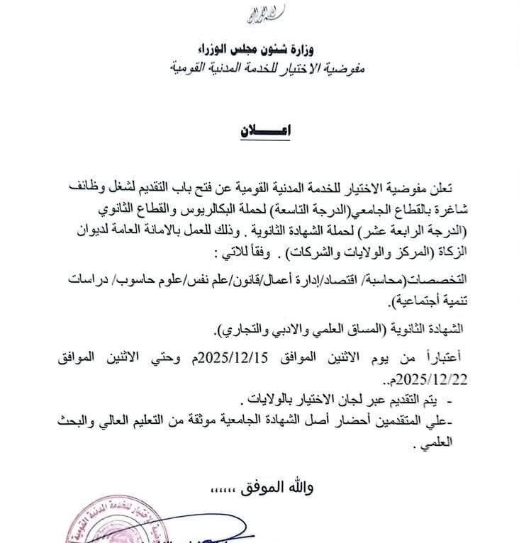 تعلن مفوضية الاختيار للخدمة المدنية القومية عن فتح باب التقديم لشغل وظائف شاغرة بالقطاع الجامعي (الدرجة التاسعة) لحملة البكالوريوس والقطاع الثانوي (الدرجة الرابعة عشر) لحملة الشهادة الثانوية.