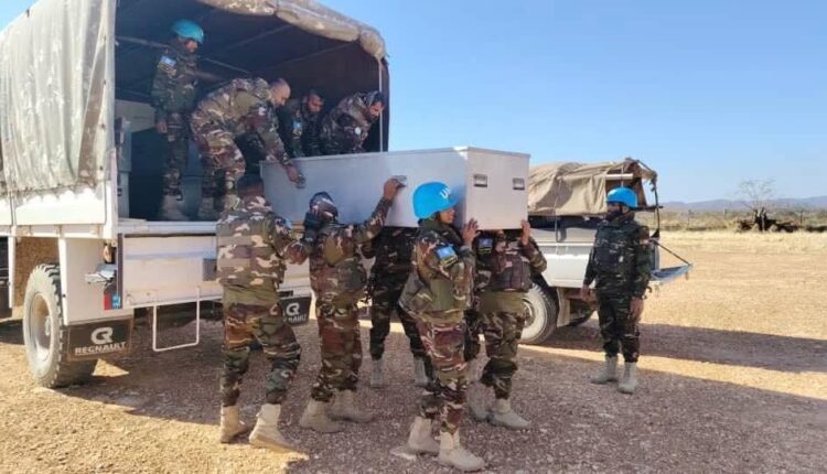 تم اليوم إجلاء جثامين وجرحى البعثة الأممية التابعين للكتيبة البنغلاديشية التي تم استهدافها من قبل المليشيا الارهابية بمسيرة بمقر البعثة بكادقلي.
