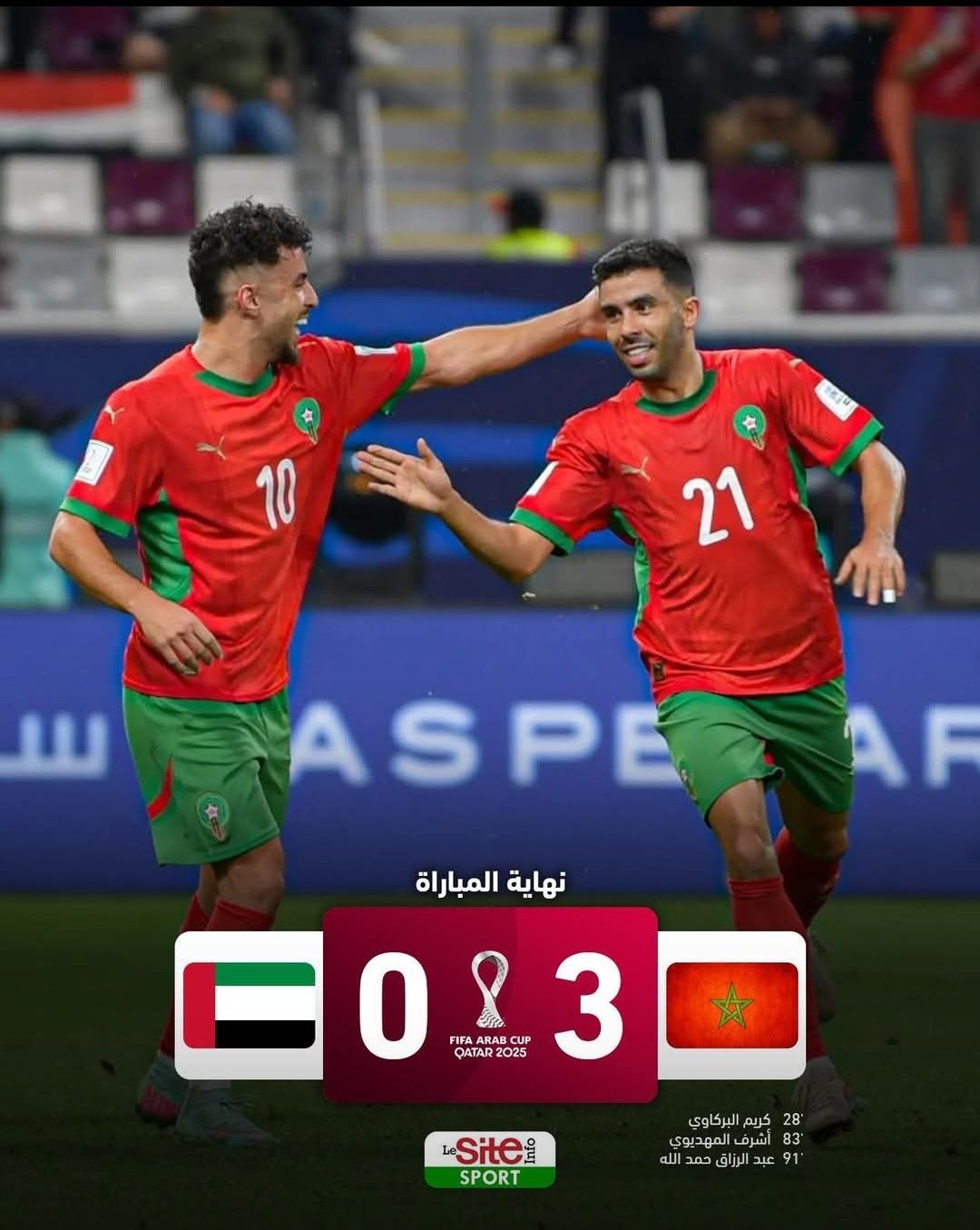 تأهل المنتخب المغربي الى نهائي كأس العرب بعد تغلبه على نظيره الاماراتي بثلاثة أهداف نظيفة في مباراة مثيرة مساء اليوم، وينتظر المغرب الفائز من مباراة السعودية و الأردن للعب مباراة النهائي