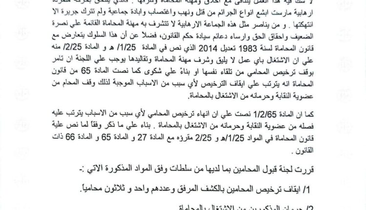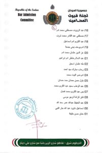 أصدرت لجنة قبول المحامين قرارا مهما اليوم قضى بتوقيف عدد 31 محاميا بسبب انتمائهم لمليشيا الدعم السريع ، فضلا عن حرمانهم من العمل في مهنة المحاماة وتم اخطار جهات الاختصاص بالقرار الذي اصدره زين العابدين محمد حمد رئيس لجنة قبول المحامين بنقابة المحامين السودانيين ، مرفق الكشف بالاسماء
