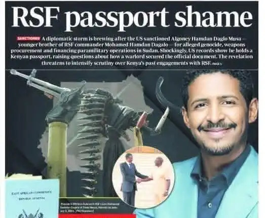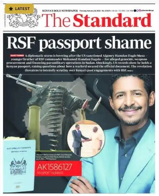 نشرت صحيفة “The Standard” (ذا ستاندرد) – إحدى أبرز الصحف الكينية وأكثرها انتشاراً – في مانشيت صفحتها الأولى لليوم الخميس، تفاصيل “عاصفة دبلوماسية” تلوح في الأفق بسبب “القوني” حيث الخبر الرئيسي يتحدث عن السجلات الأمريكية التي أظهرت أن “القوني حمدان د.قلو موسى” (الشقيق الأصغر لقائد ميلشيات الد-عم الس-ريع) يحمل جواز سفر كيني رسمي بالتزامن مع فرض الولايات المتحدة عقوبات عليه لاتهامه بالتورط في جرائم إبا.دة جماعية، وشراء أسلحة، وتمويل العمليات شبه العسكرية في السودان.