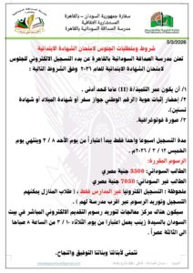 في اطار تنظيم مدرسة الصداقة السودانية بالقاهرة لإمتحانات الشهادة الإبتدائية أعلنت ادارة المدرسة ، التابعة للمستشارية الثقافية بسفارة السودان بمصر، عن بدء التسجيل الإلكتروني للجلوس لامتحان الشهادة الابتدائية للعام 2026م، وذلك وفق ضوابط محددة تبدأ اعتباراً من يوم الأحد 8 مارس وحتى الخميس 12 مارس 2026.