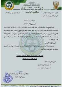 ونصّ القرار على إنهاء تكليف البروفيسور علي عيسى عبد الرحمن من مهام الأمين العام المكلف، مع توجيهه بتسليم مهامه إلى الأمين العام بالإنابة، الدكتور خالد آدم شيخة أحمد، خلال مدة لا تتجاوز أسبوعًا من تاريخ صدور القرار.