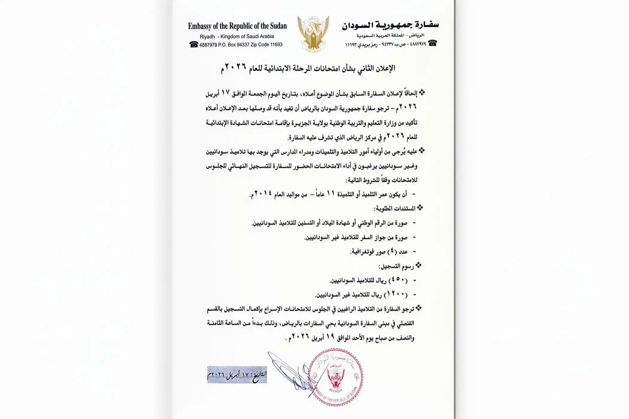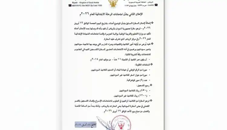 ترجو سفارة السودان بالرياض من أولياء أمور التلاميذ والتلميذات ومدراء المدارس التي يوجد بها طلاب سودانيين وغير سودانيين يرغبون في اداء الامتحانات الحضور للسفارة للتسجيل النهائي للجلوس للامتحانات وفق الشروط الآتية: