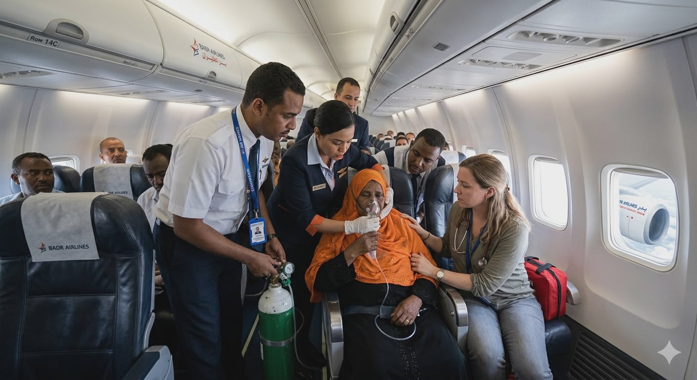 فقد باغتت وعكة صحية مفاجئة إحدى الراكبات، التي تعاني من ورم في الحلق، مما أدى لفقدانها الوعي على ارتفاع شاهق، ليتدخل طاقم الطائرة بحسم وسرعة لإنقاذ حياتها في مشهد حبس أنفاس الركاب.
