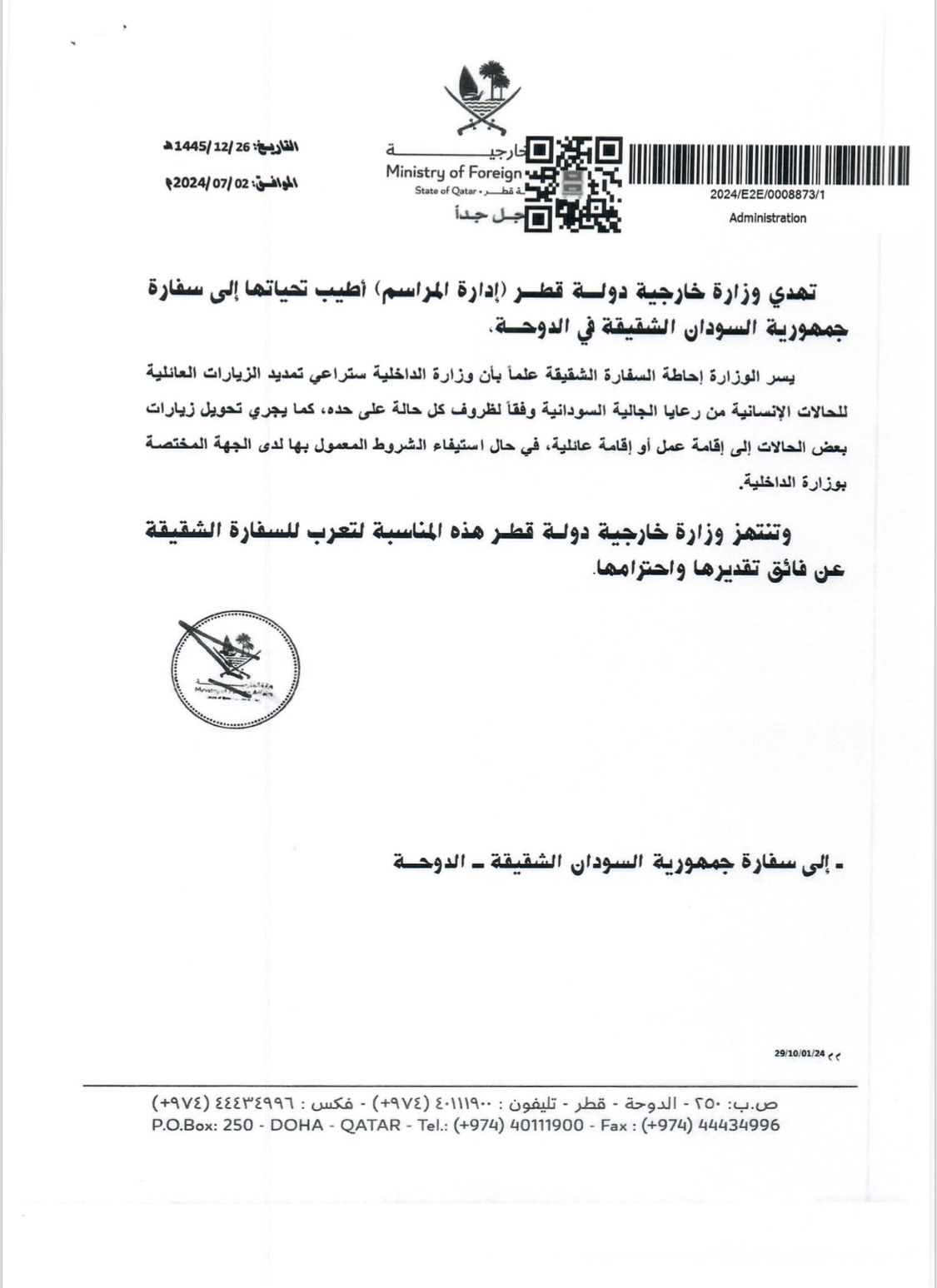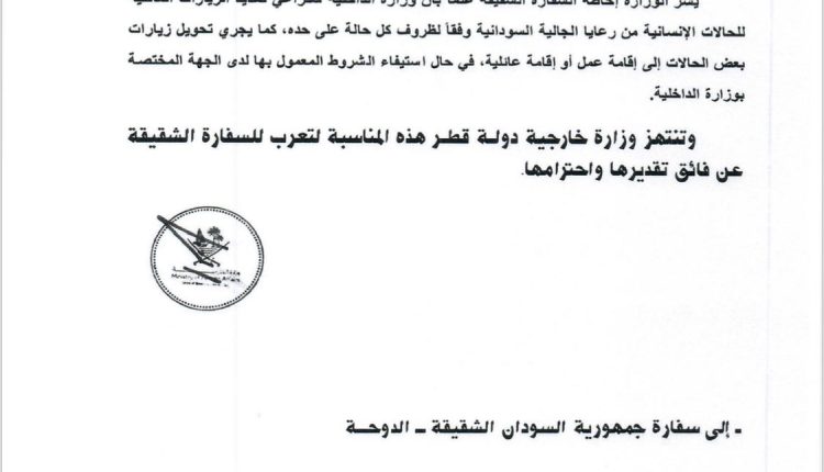 متابعة – الامين الجاك – كشفت وزارة الخارجية القطرية ان وزارة الداخلية القطرية ستراعي تمديد الزيارات  العائلية للحالات الانسانية من الجالية السودانية ، بقطر ، وذلك وفق لظروف كل حالة على حدى ، فضلا عن تحويل بعض الزيارات الي اقامة عمل او اقامة عائلية ، في حالة استيفاء الشروط المعمول بها لدى الجهة المختصة بوزارة الداخلية ، و اعربت وزارة خارجية دولة قطر عن فائق تقديرها و إحترامها لسفارة السودان بدولة قطر الشقيقة