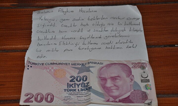 وفوجئ إمام جامع الرشيدية في مرسين، خليل إردم، عندما قدم لإقامة صلاة الظهر، برسالة في المسجد، ومعها ورقة نقدية من فئة مئتي ليرة تركية، وهي الأعلى بين فئات النقود التركية (نحو 6 دولارات).
