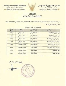 اعلنت سفارة جمهورية السودان بالرياض عن تحديث للمدارس السودانية المعتمدة لديها ، وهي كتالي